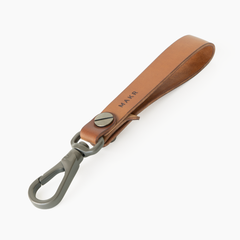 A multi-use "tether" with integrated keeper and secure button stud attachment. Custom gunmetal snap hook.