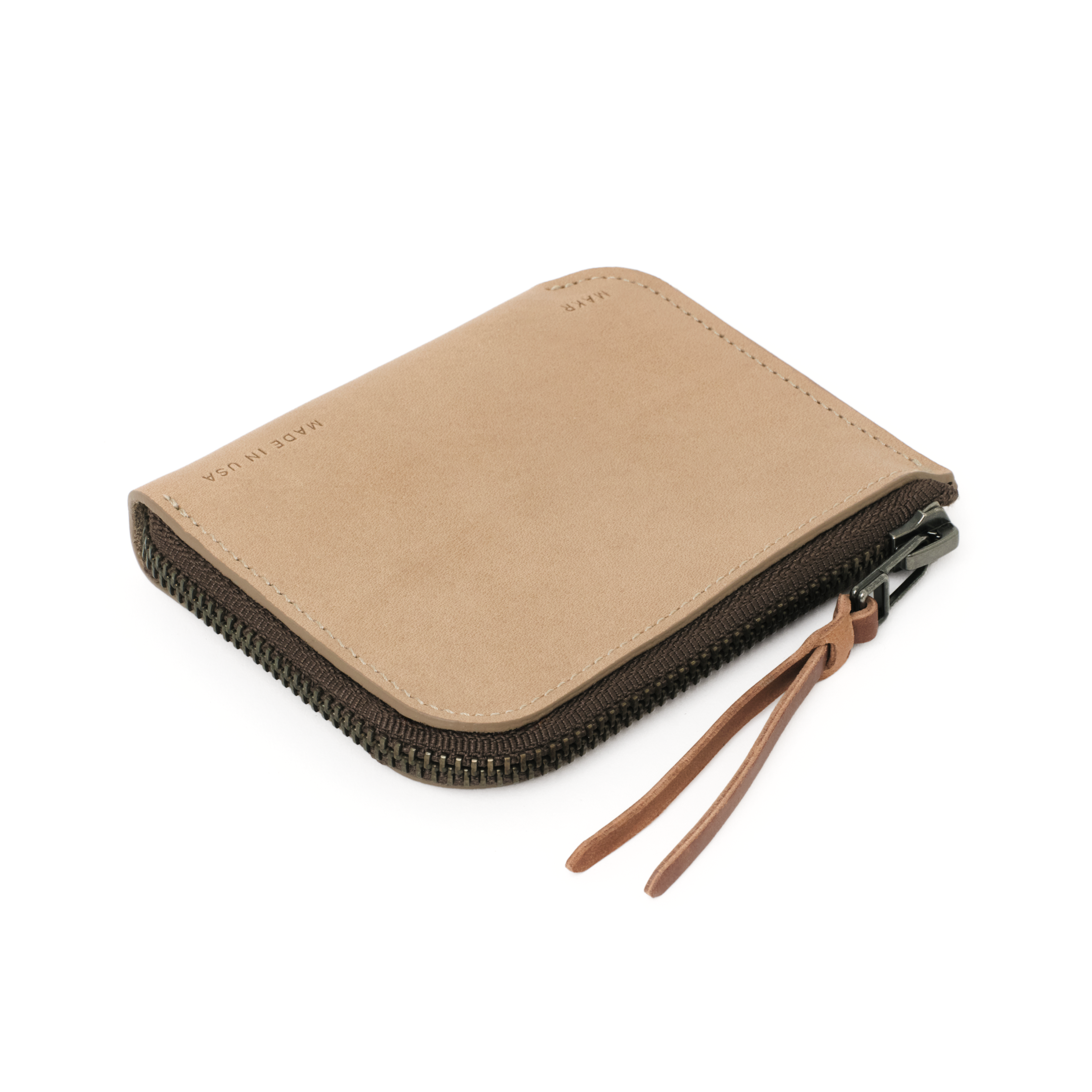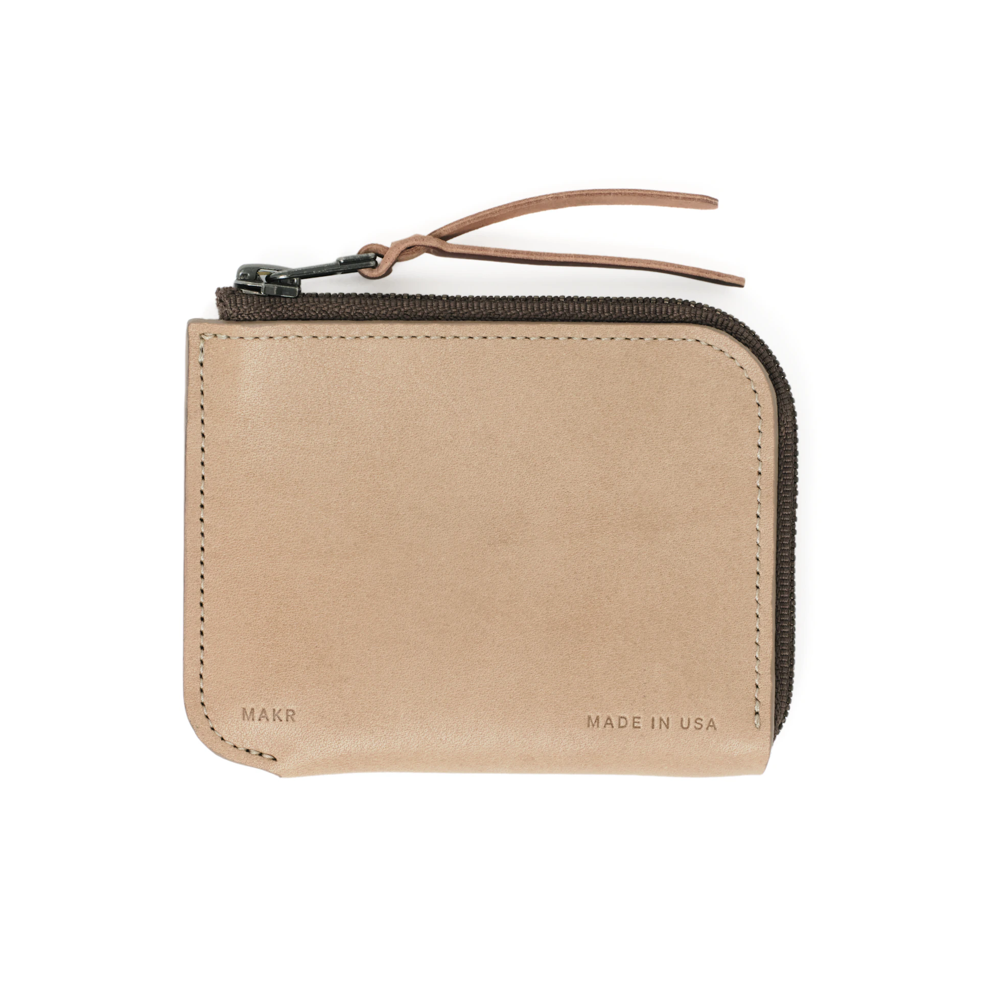 Revised Corner zip with two interior partitions. Our largest capacity wallet. Accommodates single folded cash and many cards.